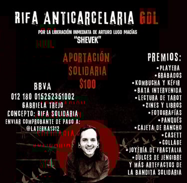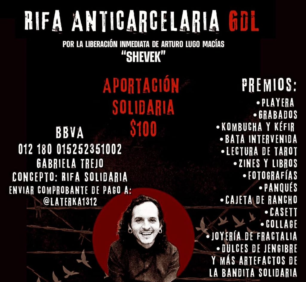 En Guadalajara, distintos espacios culturales y colectivos han impulsado acciones concretas de apoyo a la exigencia de libertad de Arturo Lugo Macías “Sheveck”. Entre ellas se encuentra la Rifa Anticarcelaria GDL, con una aportación solidaria de 100 pesos, organizada para recaudar fondos y difundir el caso, así como actividades culturales presenciales como Ruido Solidario #1, realizado el 17 de enero en La Terka, ubicada en Juan Manuel 765, a partir de las 20:00 horas, con cooperación voluntaria y participación de proyectos musicales y artísticos locales.