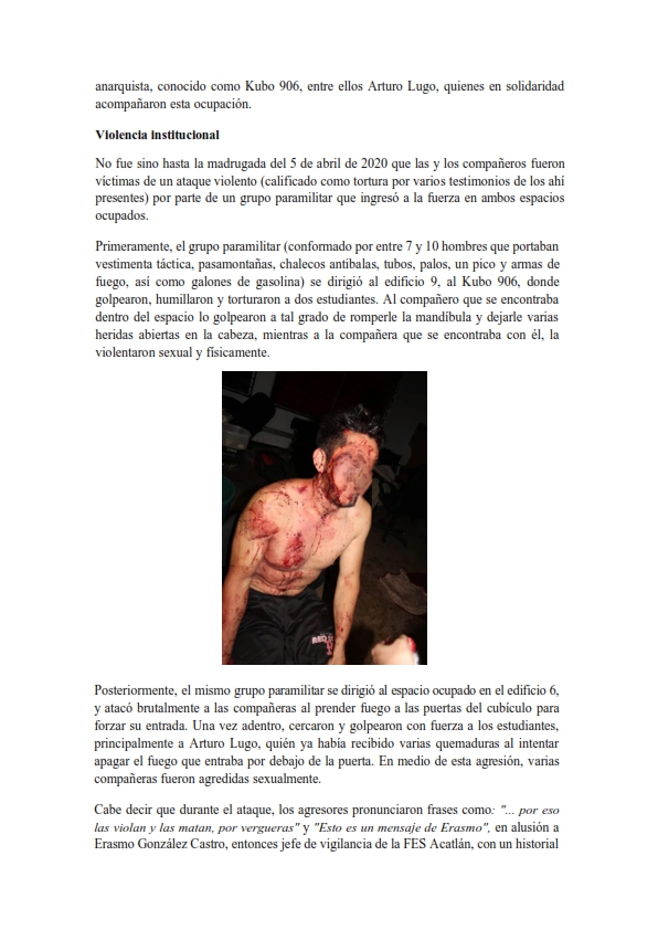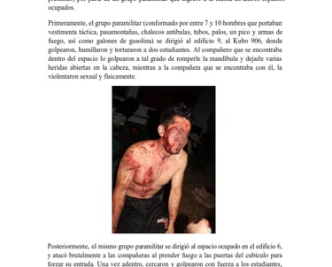 La madrugada del 5 de abril de 2020, los espacios ocupados en los edificios 6 y 9 fueron atacados de manera violenta. Durante los hechos, estudiantes fueron agredidas física y sexualmente, mientras que varios compañeros resultaron gravemente heridos.