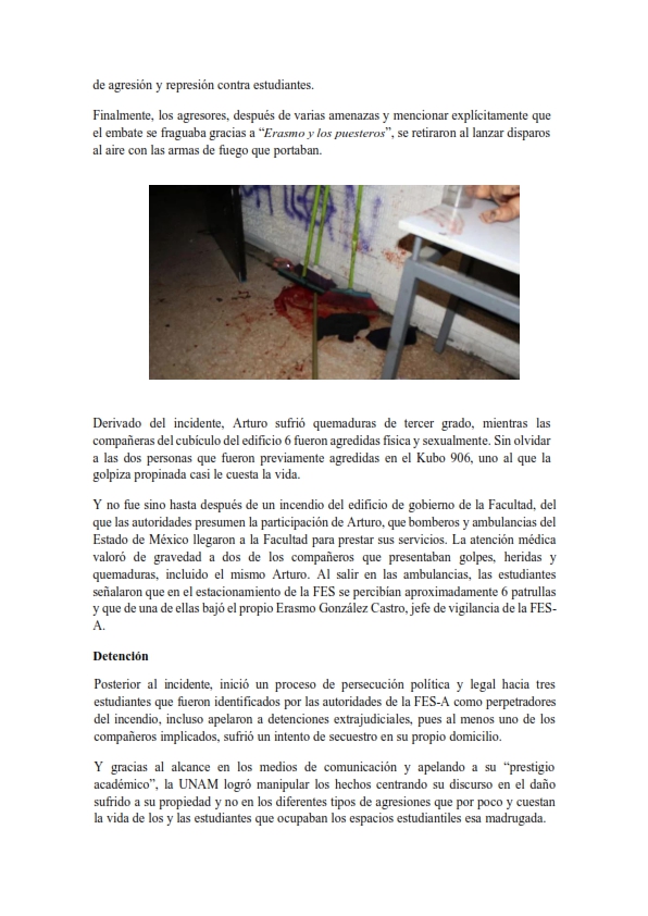 El proceso judicial se ha concentrado en los daños materiales derivados de ese incendio, mientras que las agresiones físicas y sexuales cometidas contra estudiantes durante el mismo evento no han sido esclarecidas ni investigadas públicamente.