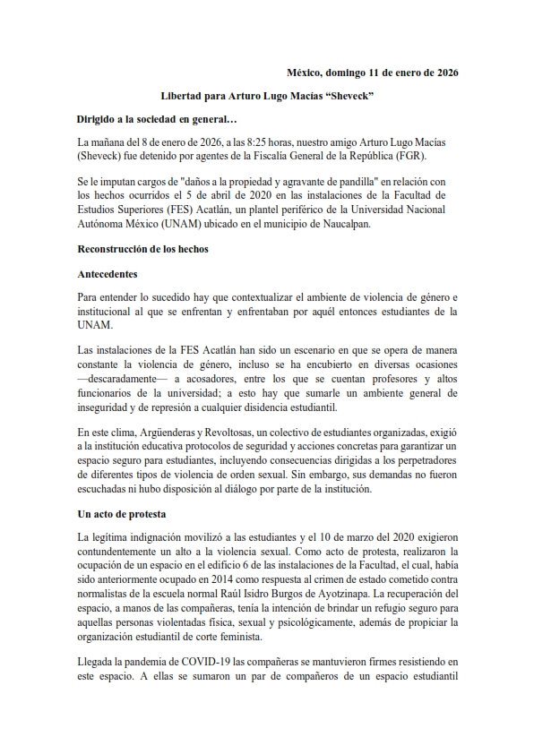 La mañana del 8 de enero de 2026, a las 8:25 horas, Arturo Lugo Macías, conocido como “Sheveck”, fue detenido por agentes de la Fiscalía General de la República (FGR). Su detención se relaciona con hechos ocurridos el 5 de abril de 2020 en la Facultad de Estudios Superiores Acatlán de la UNAM, ubicada en el municipio de Naucalpan, Estado de México.
