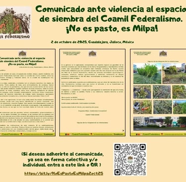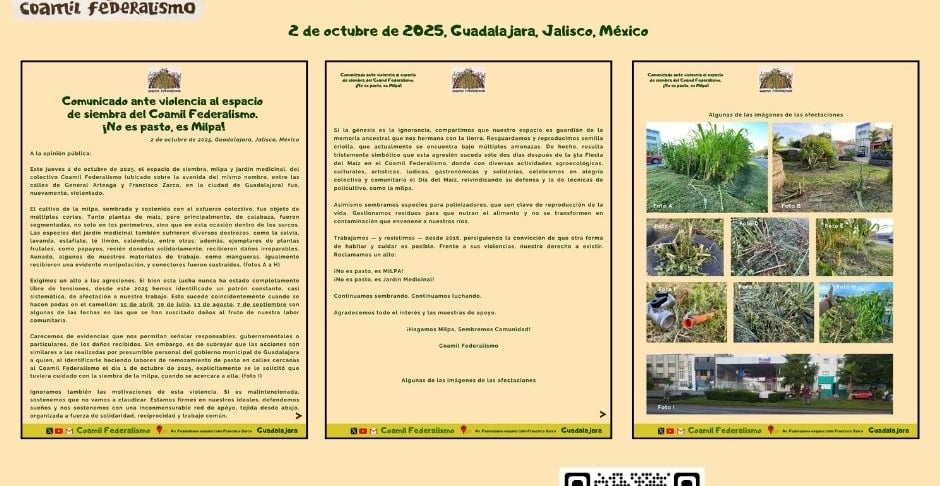 El Coamil Federalismo denunció la destrucción violenta de su espacio de siembra comunitaria en Guadalajara. A través del comunicado “¡No es pasto, es milpa!”, el colectivo defiende la milpa como territorio de vida, resistencia y cuidado colectivo, e invita a solidarizarse y adherirse al pronunciamiento en defensa de la tierra y la comunidad.